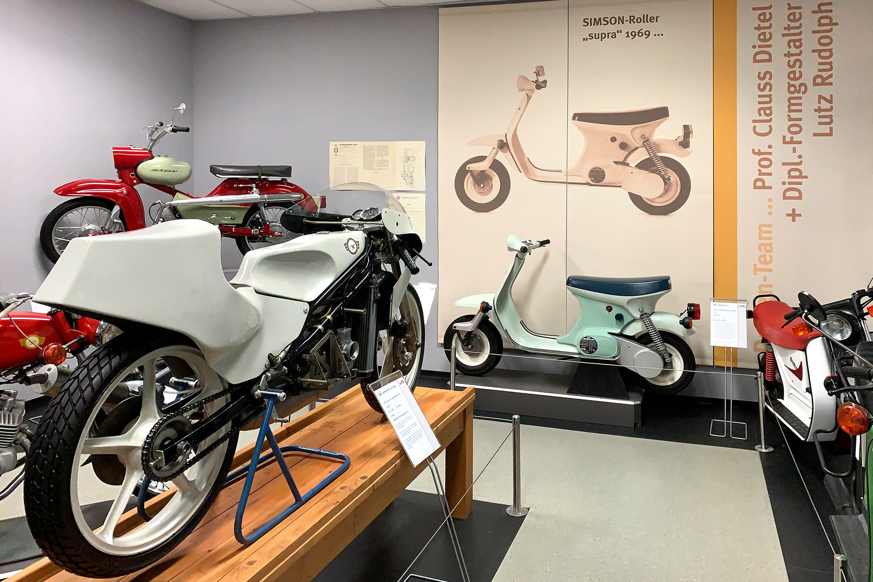 Einen besonderen Raum nimmt dabei der überaus erfolgreiche Suhler Motorsport ein. Sie finden im Museum die Simson-Motorräder der Europa- und Weltmeister sowie den legendären Greifzu-Rennwagen. Unsere Sonderausstellung gibt mit vielfältigen Produkten anderer Hersteller Einblicke in die Welt des Fahrzeugbaus.