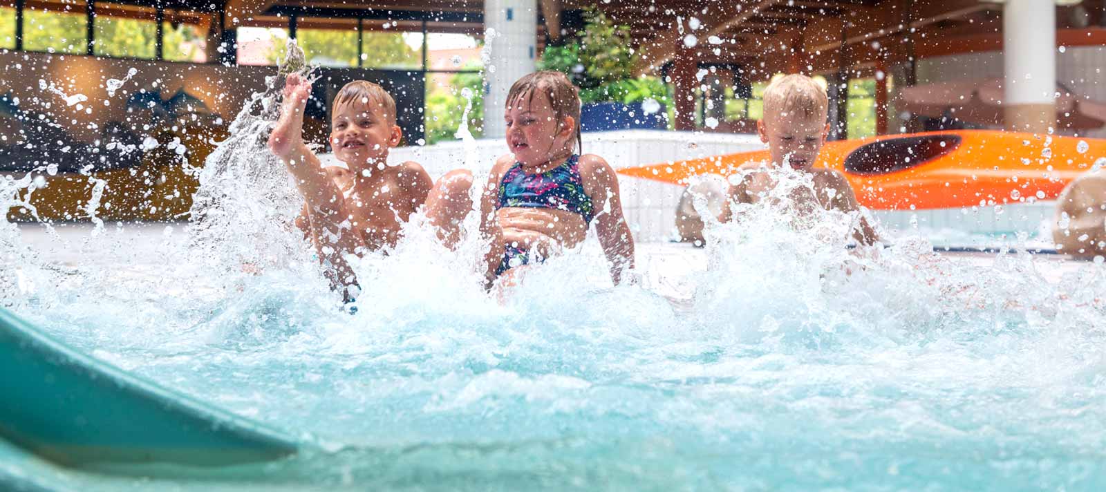 Schwimmen. Tauchen.Treiben lassen! In den fünf Solebecken, im Wildwasserkanal oder auf der Riesenrutsche können Groß und Klein viel erleben.