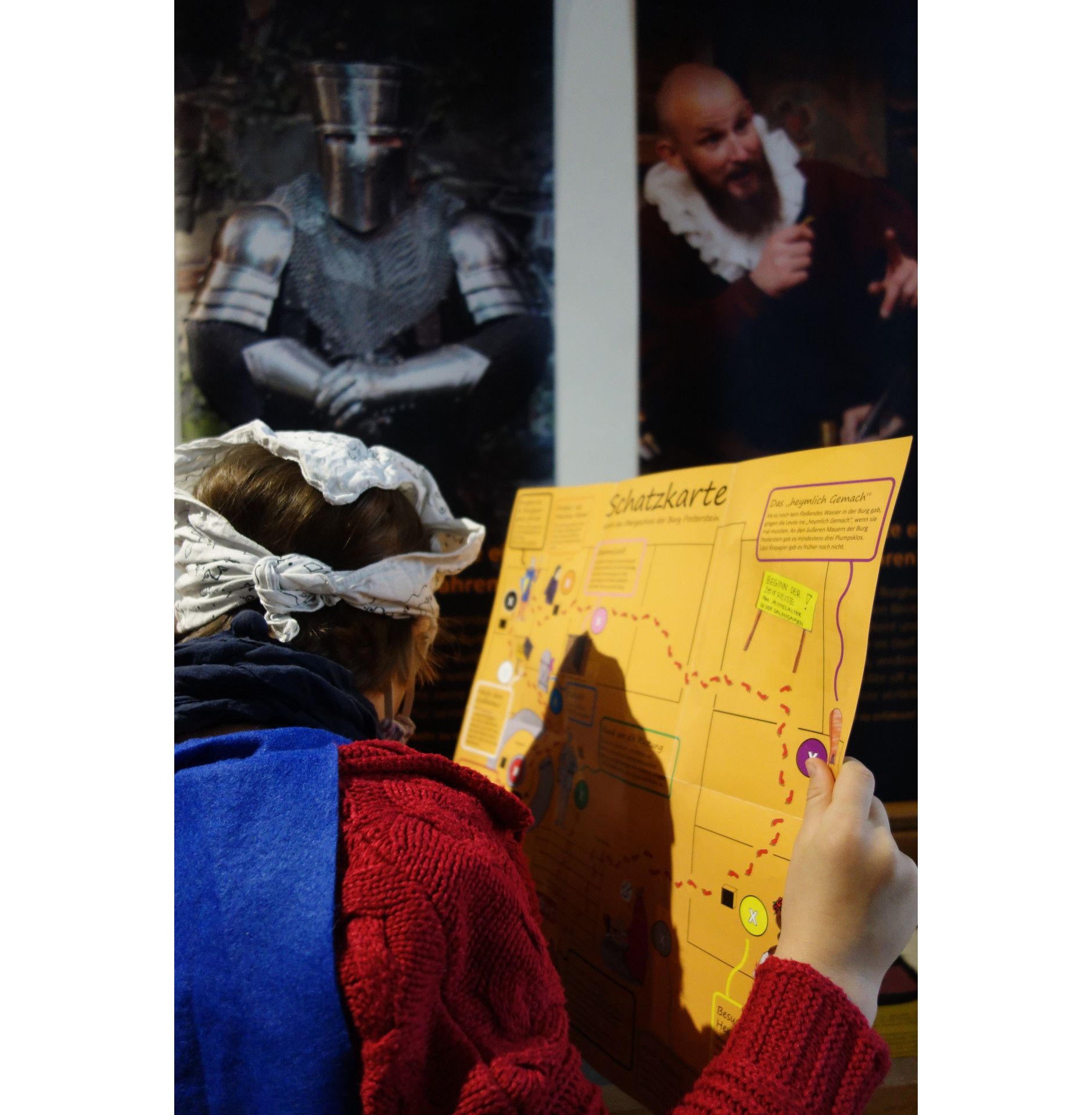 Die Exposition führt parallel zur ständigen Ausstellung des Museums durch die gesamte Burg. Mit Film, Ton und Text lädt sie spielerisch dazu ein, die Geschichte zu entdecken. Eine Schatzkarte führt die Kinder vom Verlies bis hinauf auf den Turm.