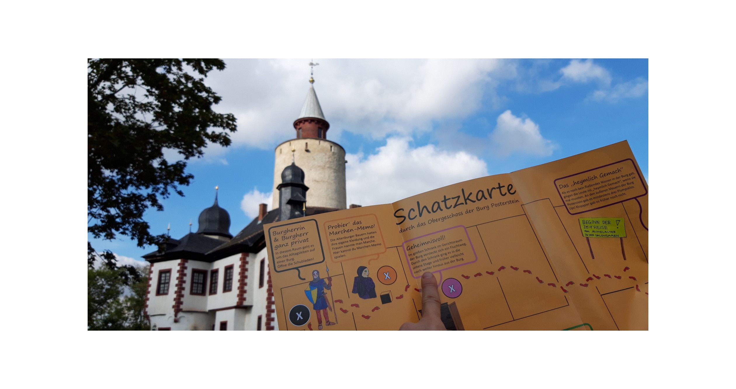 Die Familienausstellung „Die Kinderburg“ in der 800 Jahre alten Burg Posterstein zeigt Geschichte zum Anfassen. Eine eigene Schatzkarte führt Kinder durch die ganze Burg - vom Verlies bis auf den Bergfried.