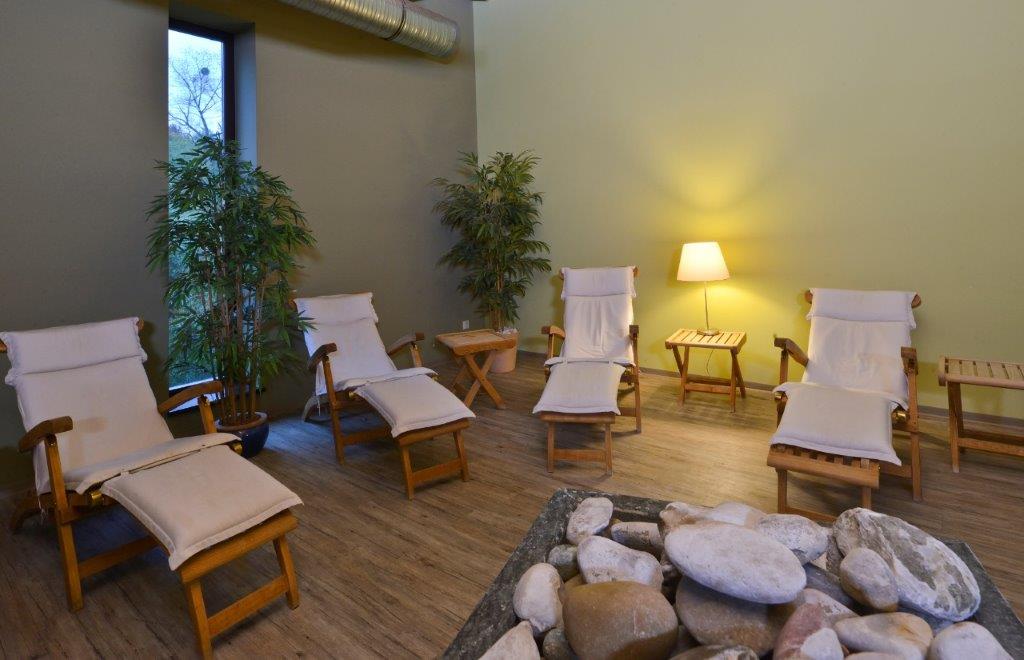 großzügigem Ruhehaus finden Sie Ihren Platz, um nach dem Saunagang